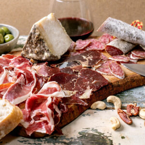 La dégustation est accompagnée d’une sélection de produits locaux : jambon ibérique, saucisson, fromages, pain et autres spécialités du terroir.